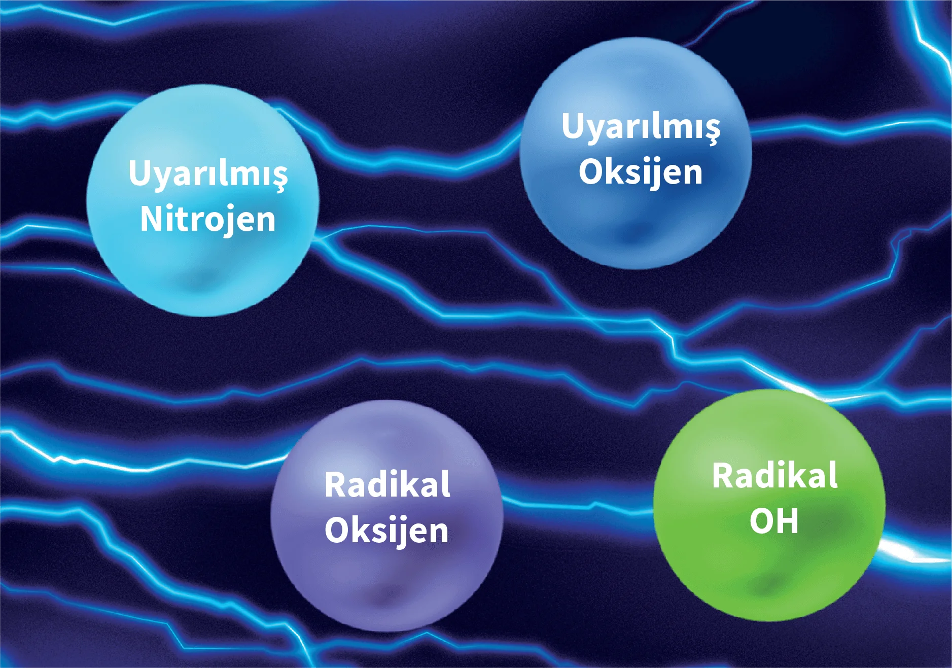 Elektronlar çarpışır ve havadaki nitrojen ve oksijenle birleşerek dört farklı türde bileşen meydana getirir.