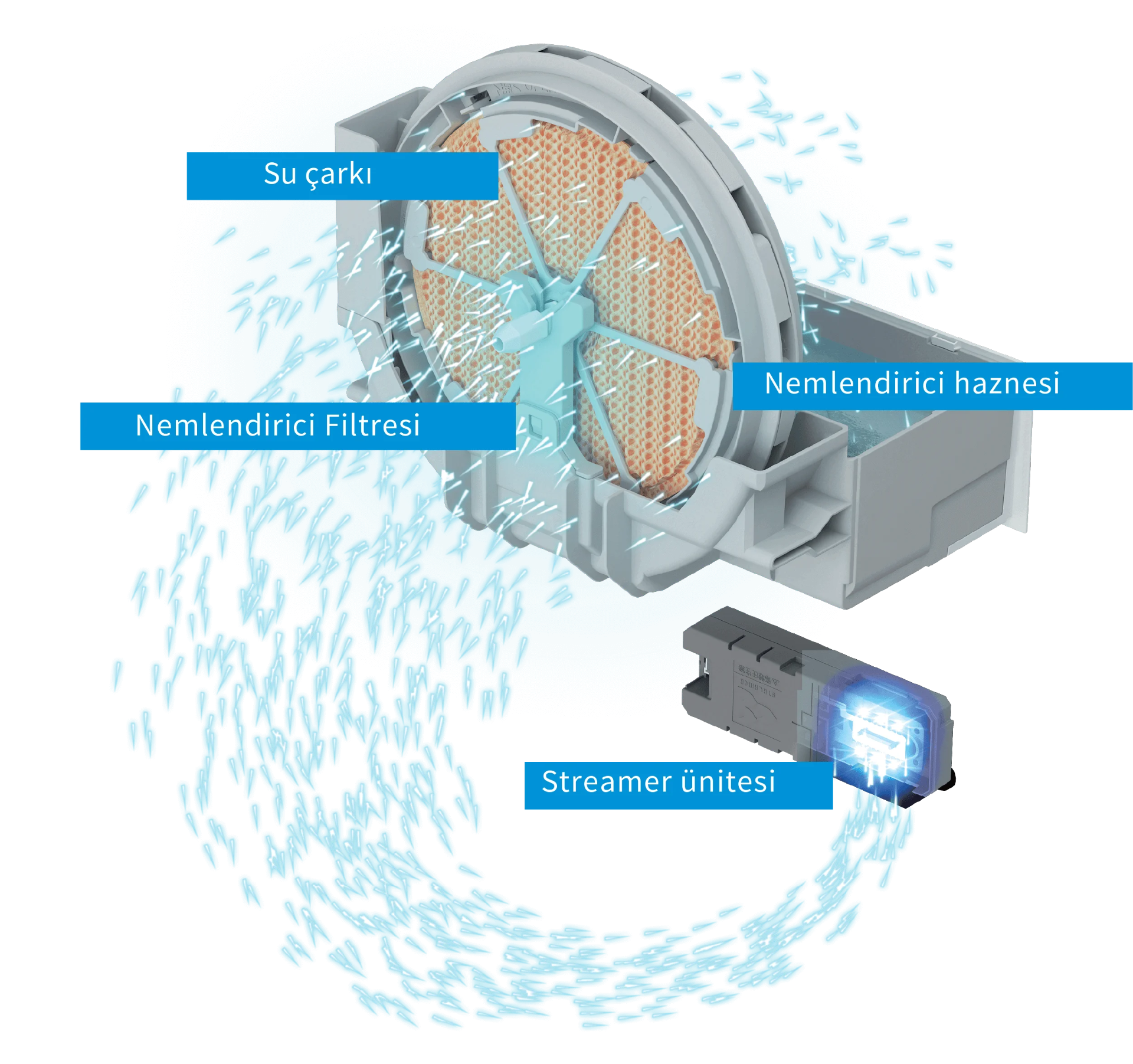 1. Yüksek güçlü bir plazma deşarj teknolojisi olan Streamer ünitesi, zararlı maddelerin bileşenlerine bozunmasını sağlar. Bu maddeler, HEPA filtresinde tutulur veya koku giderici filtre tarafından emilir.
