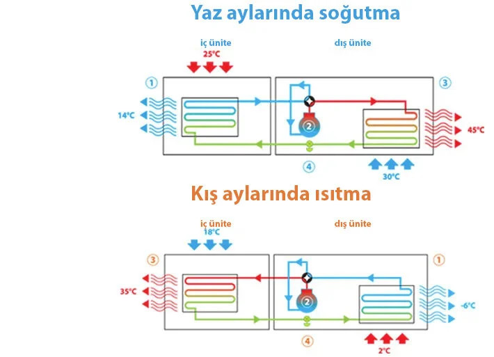 Isı pompası, ısıyı aktararak sıcaklığı kontrol eder. Bir ısı pompasının üç temel bileşeni vardır: dış ünite (evaporatör), iç ünite(ler) (kondenser) ve soğutucu akışkan. Soğutucu akışkan, dış ve iç ünite(ler) arasında dolaşırken ısıyı aktarır.